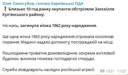 Российские войска утром обстреляли Купянский район, погибла женщина