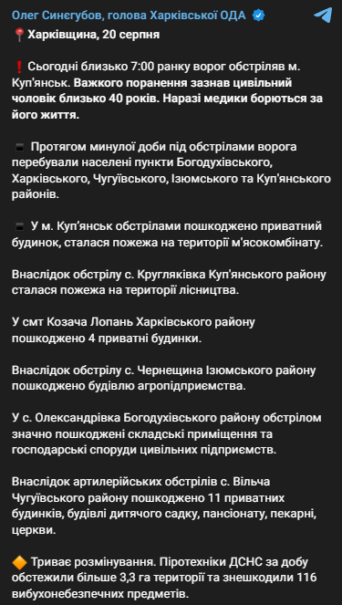 "Сегодня около 7:00 утра враг обстрелял город Купянск. Тяжелое ранение получил гражданский мужчина около 40 лет. В настоящее время медики борются за его жизнь", - написал Синегубов.