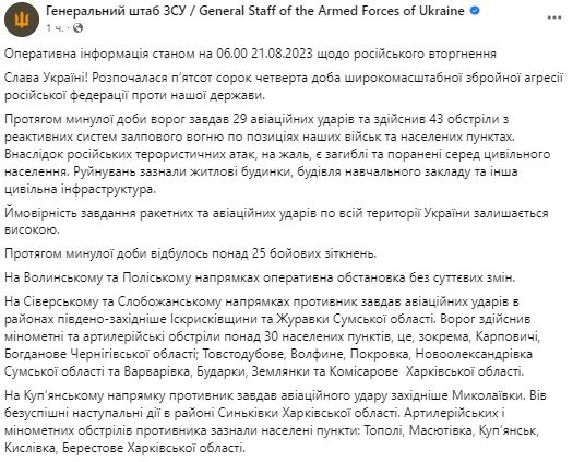 Утром 21 августа Генштаб ВСУ обнародовал сводку о ситуации на фронте.
