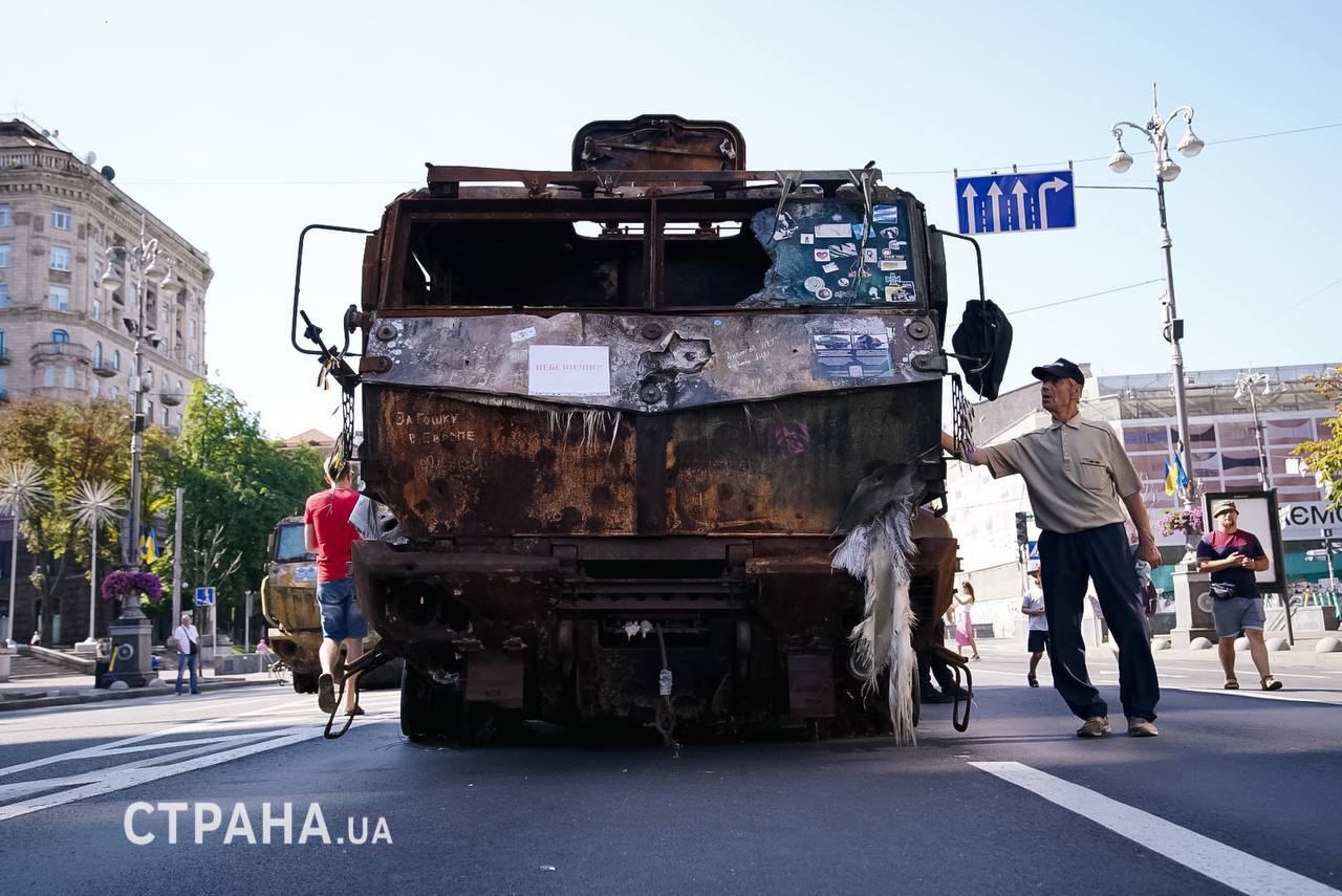 В Киеве на Крещатике в День независимости открыли выставку трофейной российской техники, которую установили на улице раньше, но закрыли оградительной лентой.