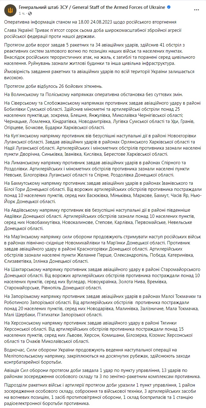 Генштаб ВСУ опубликовал оперативную информацию о российском вторжении по состоянию на 18:00 24 августа.