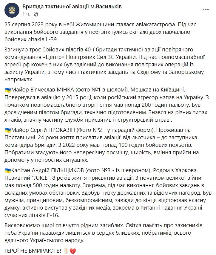 Бригада тактической авиации Василькова сообщила, что кроме Андрея Пильщикова "Джуса" погибли майоры Вячеслав Минка и Сергей Проказин.