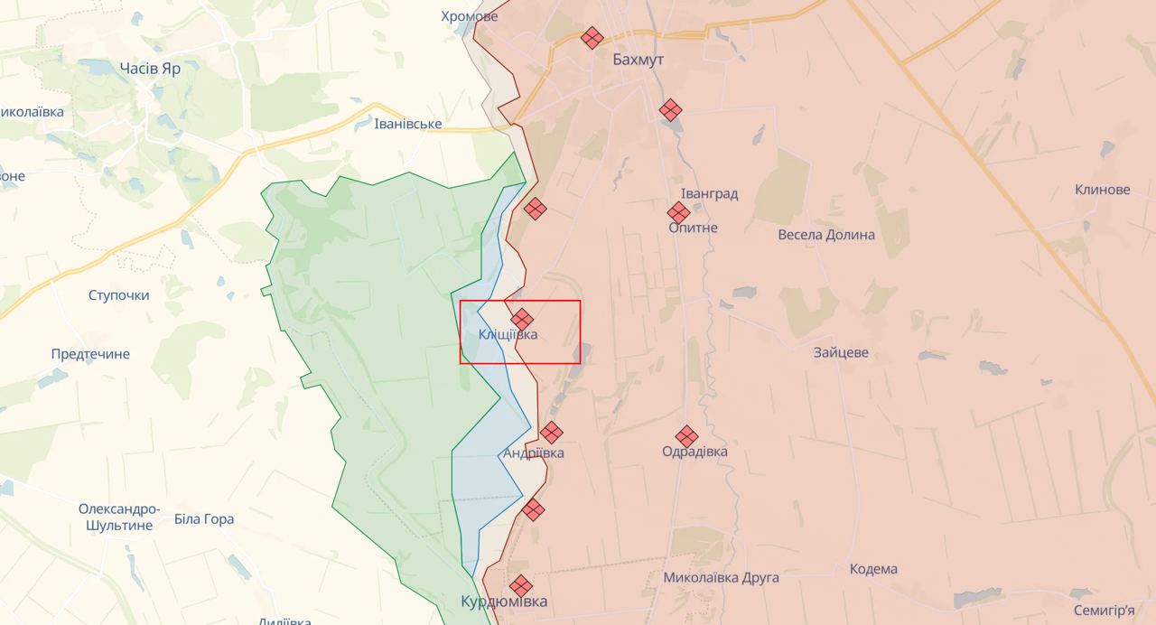 14.15 Под Бахмутом ВСУ вытеснили армию РФ с позиций в центральной части Клещеевки, а также восточнее населенного пункта, сообщает замминистра обороны Маляр.