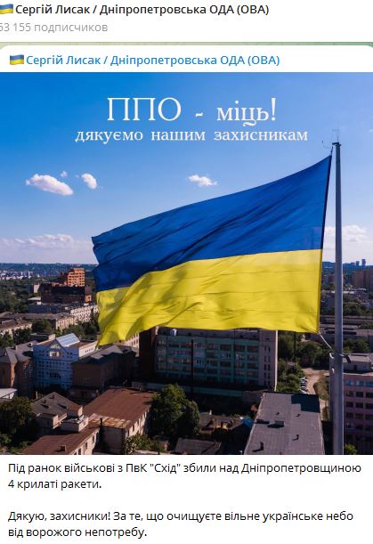 Об этом сообщил в своем Telegram-канале начальник Днепропетровской обладминистрации Сергей Лысак.