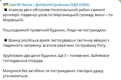 Также россияне дважды за ночь обстреляли Никопольский район из тяжелой артиллерии. Вечером под ударом была Марганецкая громада, ночью – Мировская. Поврежден частный дом. Люди не пострадали.