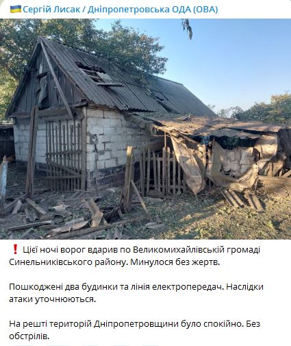 Этой ночью враг ударил по Великомихайловской громаде Синельниковского района. Обошлось без жертв.