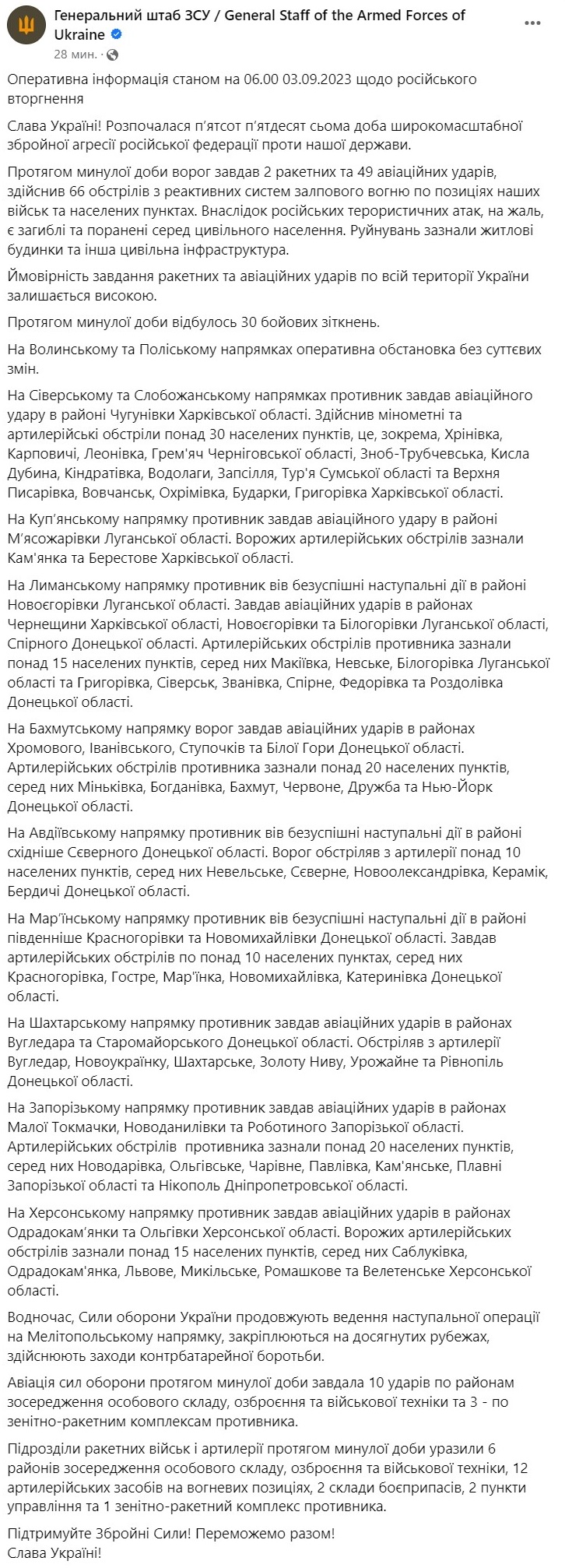 За прошедшие сутки Россия нанесла 2 ракетных и 49 авиационных ударов, совершила 66 обстрелов из реактивных систем залпового огня по позициям наших войск и населенным пунктам. В течение суток произошло 30 боевых столкновений.