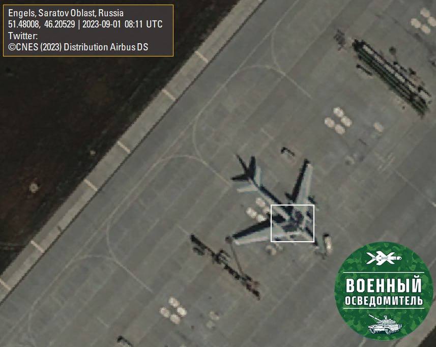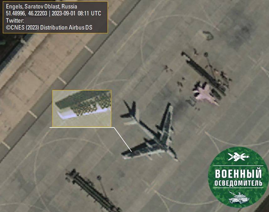 На аэродроме в Энгельсе россияне обложили автопокрышками бомбардировщик Ту-95МС. Спутниковые снимки