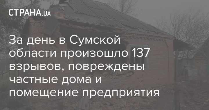 В течение 3 сентября россияне совершили двадцать обстрелов Сумской области. В результате 137 взрывов повреждены частные дома и помещение агропредприятия.