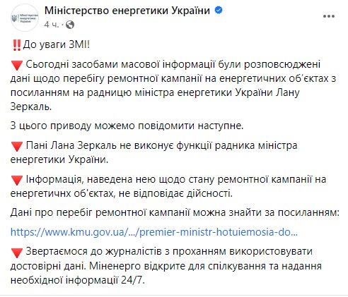"Елена Зеркаль не выполняет функции советника министра энергетики Украины. Информация, приведенная ею о состоянии ремонтной кампании на энергетических объектах, не соответствует действительности", - заявляют в Минэнерго.
