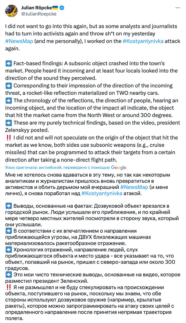 Военный обозреватель немецкого издания Bild Юлиан Репке утверждает, что ракета вчера прилетела в Константиновку с северо-запада. То есть со стороны территории, подконтрольной Украине.