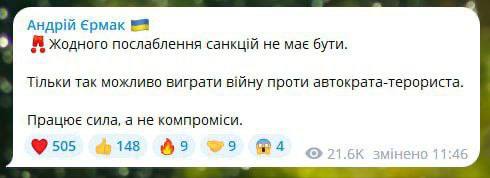 Он призывает не отменять санкции. "Работает сила, а не компромиссы", - сказал Ермак.
