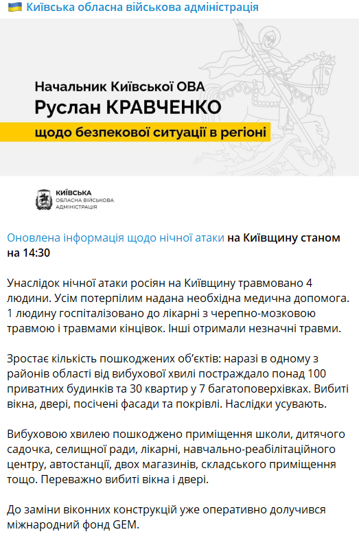 В Киевской области после ночной атаки беспилотников четверо пострадавших, один из них в больнице.