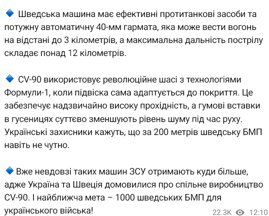 "Украина и Швеция договорились о совместном производстве CV-90. И ближайшая цель - 1 000 шведских БМП для украинского войска", - говорится в сообщении.