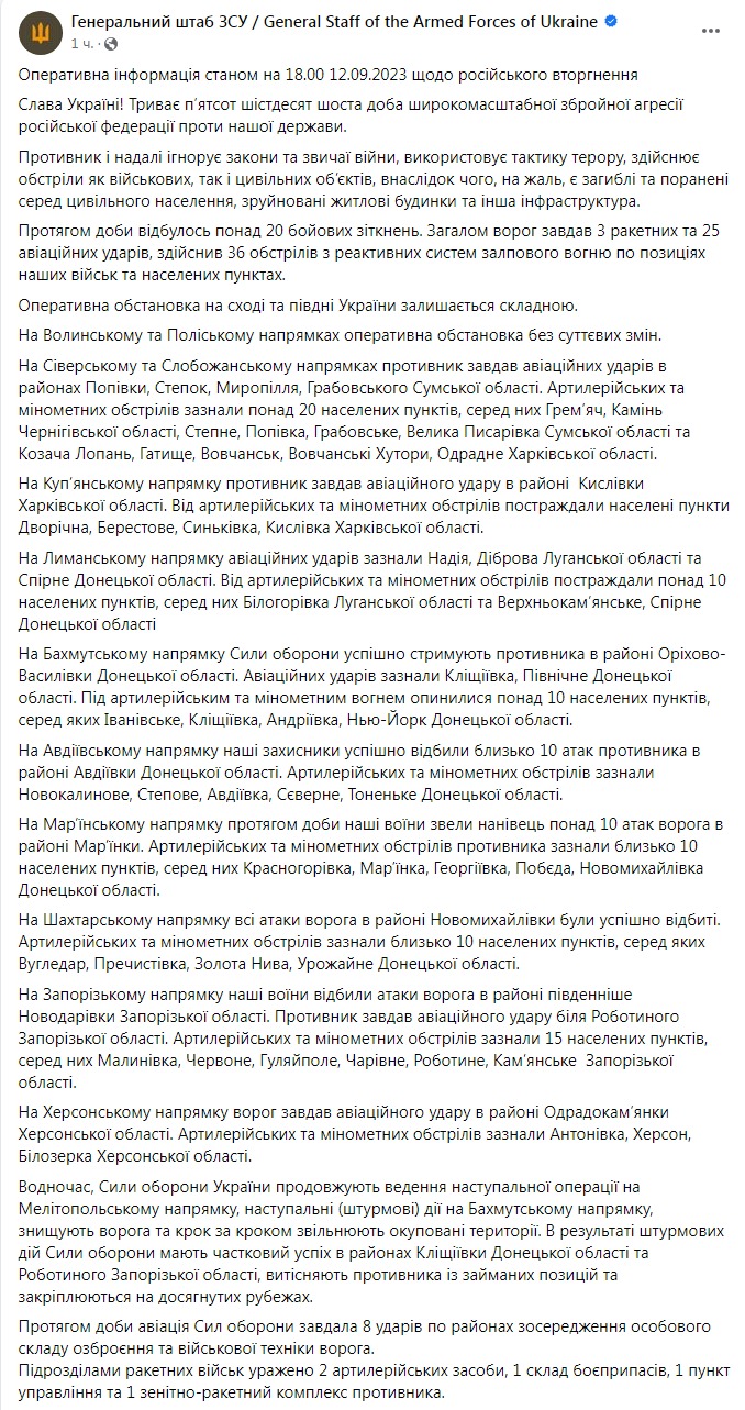 Генштаб ВСУ опубликовал оперативную информацию о российском вторжении по состоянию на 18:00 12 сентября.