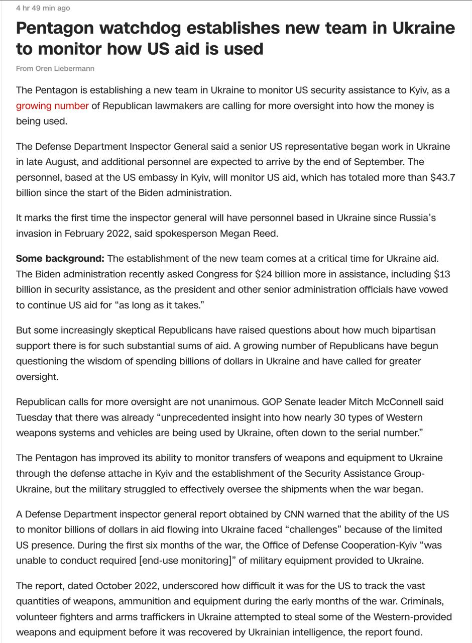 В отчете генинспектора Пентагона говорится, что способность США отслеживать миллиарды долларов помощи, поступающей в Украину, столкнулась с «проблемами» из-за ограниченного присутствия США, передает CNN.
