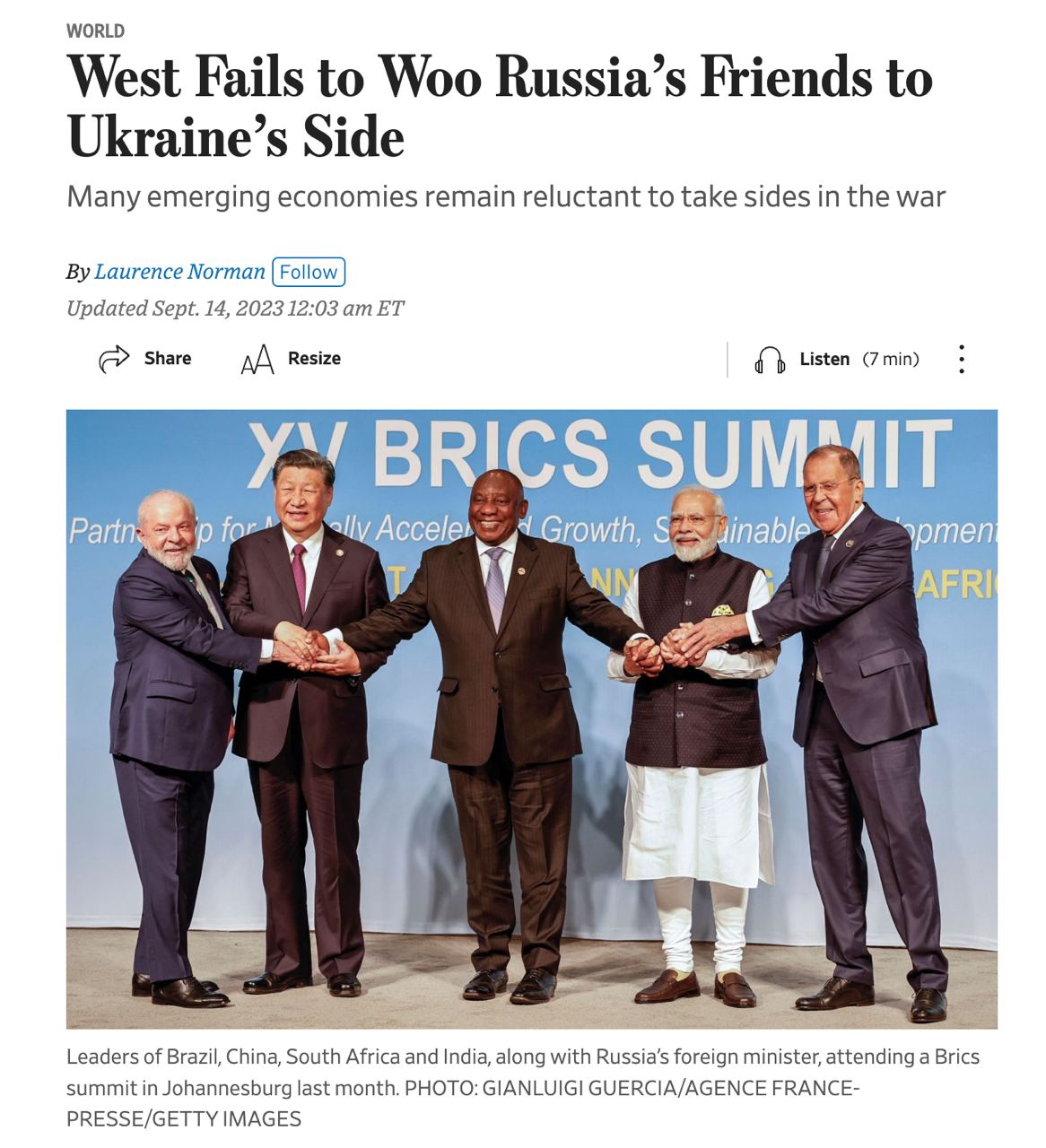 11.45 "Западу не удалось переманить друзей России на сторону Украины", - пишет в заголовке The Wall Street Journal, имея ввиду страны "глобального Юга".
