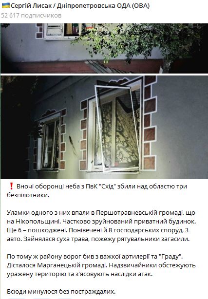Обломки одного из них упали в Первомайской громаде Никопольщины. Частично разрушен частный дом. Еще шесть – повреждены. Повреждены и восемь хозяйственных построек, три авто. Загорелась сухая трава, пожар спасатели потушили.