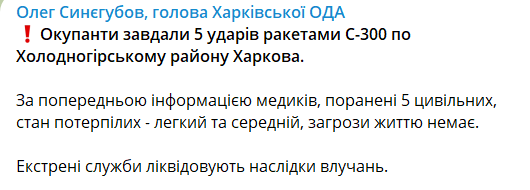 "Оккупанты нанесли 5 ударов ракетами С-300 по Холодногорскому району Харькова. По предварительной информации медиков, ранены 5 гражданских, состояние пострадавших - легкое и среднее, угрозы жизни нет",-  написал Синегубов.