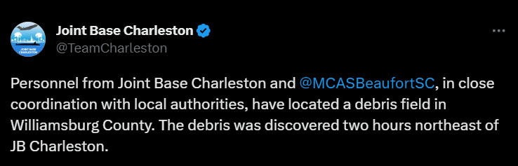 Военные обнаружили обломки самолета в двух часах к северо-востоку от базы Чарльстона. В поисках им помогали местные власти.
