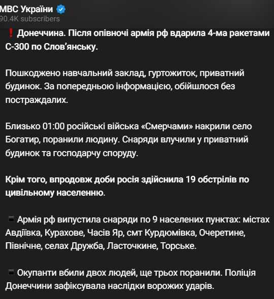 Также "Смерчами" накрыли село Богатырь. Снаряды попали в частный дом и хозяйственное сооружение, ранен человек.