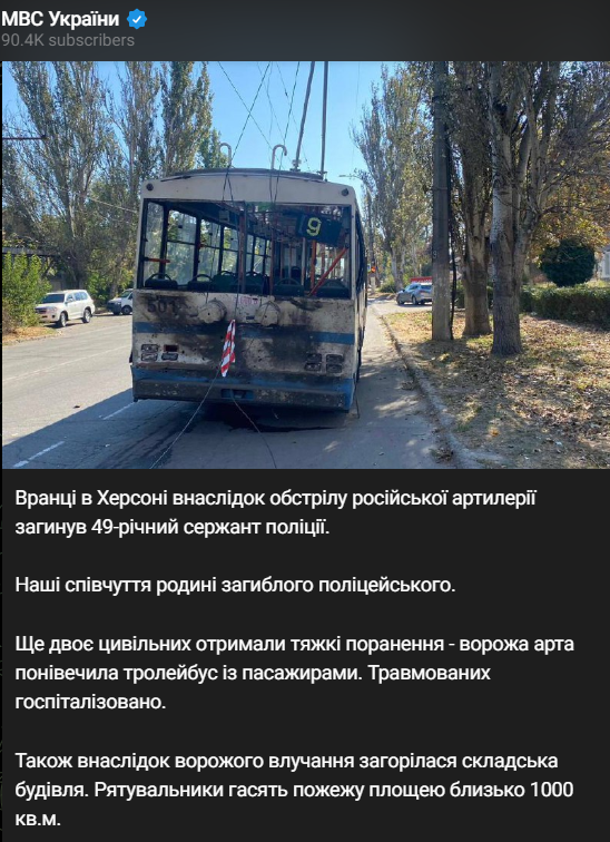 Также сегодня утром войска РФ обстреляли Корабельный район Херсона и попали в троллейбус. Ранены два пассажира - мужчины 33 и 57 лет.