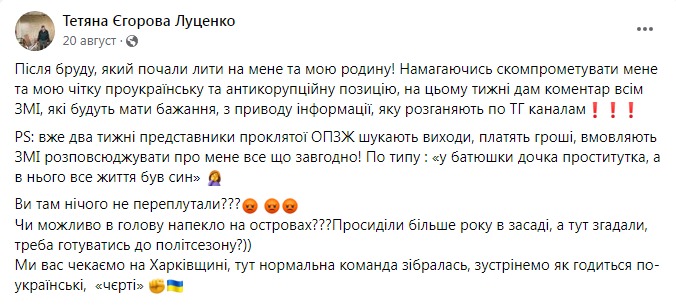 "После грязи, которую начали лить на меня и мою семью! Пытаясь скомпрометировать меня и мою четкую проукраинскую и антикоррупционную позицию..." - написала она.