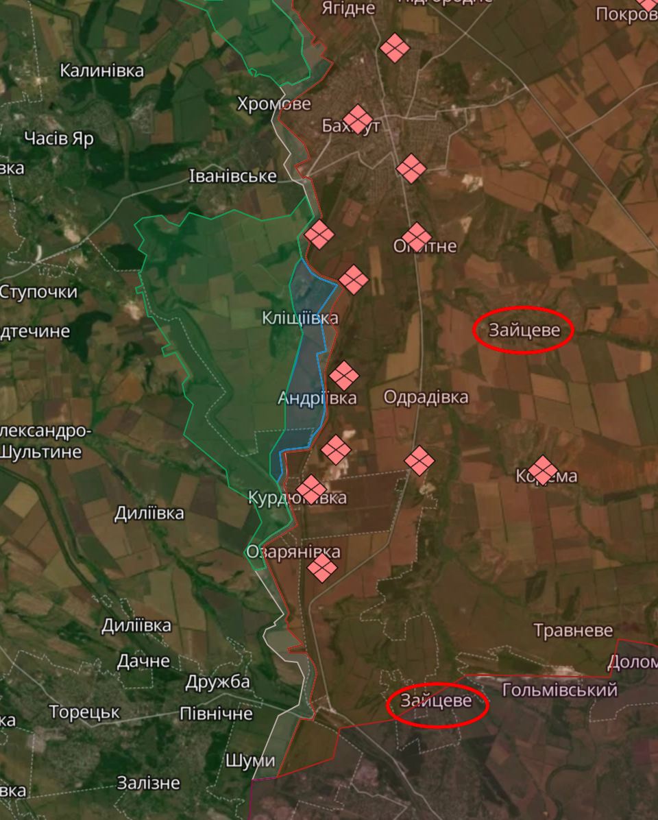 Какого именно Зайцево - не уточняется, под Бахмутом есть два села с таким названием, оба находятся восточнее дороги Бахмут - Горловка. Ближе к линии фронта Зайцево под Горловкой, а не Бахмутом. При этом Зайцево под Бахмутом находится к востоку от недавно освобожденной (но уже фактически не существующей) Клещеевки.
