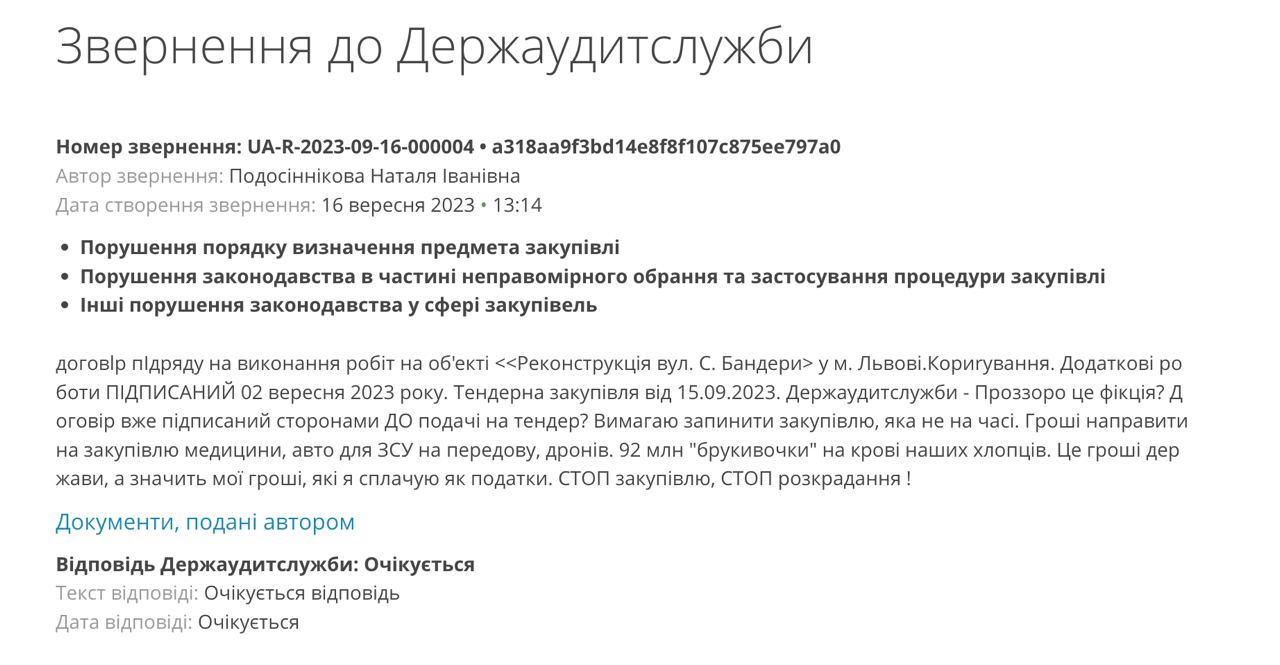 На результату тендера уже подали жалобу в Госаудитслужбу. Автор жалобы Наталья Подосинникова обратила внимание, что размещенный договор с победителем аукциона подписан 2 сентября, а тендер был объявлен только 15 числа.