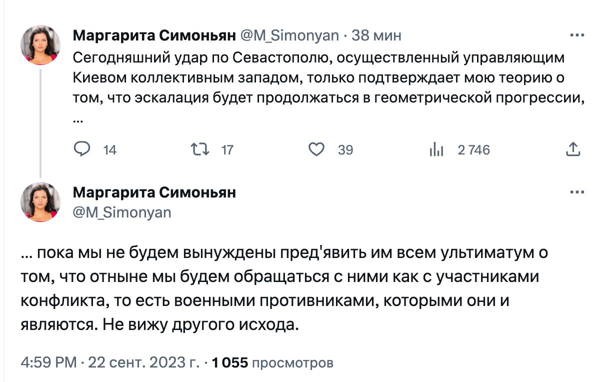 17.47 Главред RT Маргарита Симоньян после удара по штабу Черноморского флота в Севастополе призвала руководство РФ объявить ультиматум странам "коллективного Запада".