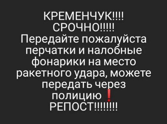 19.47 В пабликах Кременчуга призывают срочно нести на место прилета фонарики, рукавицы и средства промывания глаз.