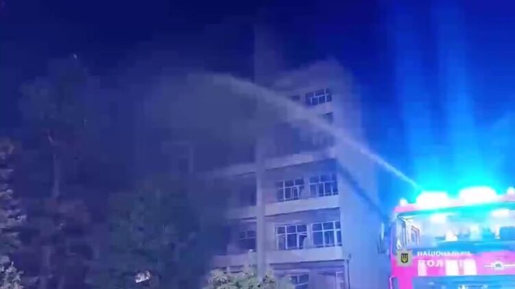 Судя по кадрам, горит пансионат. Над крышей сооружения поднимается дым, видно, что в окнах здания выбиты стёкла, из оконных проёмов вырывается пламя. С пожаром борются работники ГСЧС.