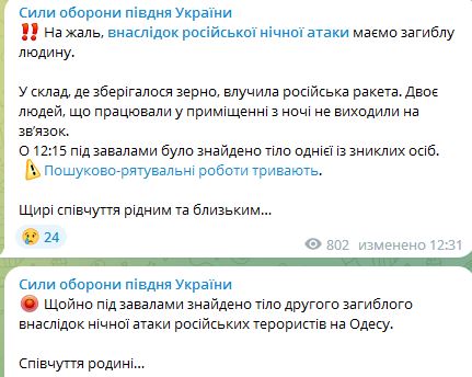 В Одессе под завалами нашли тела двух погибших в результате ночной атаки РФ. Оба погибших работали на зернохранилище.