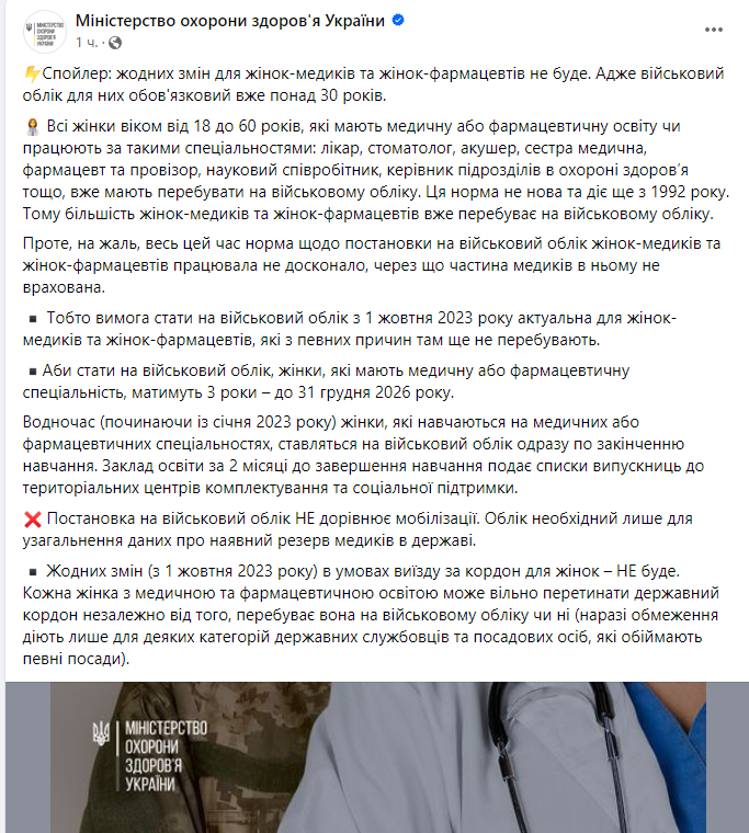 "Каждая женщина с медицинским и фармацевтическим образованием может свободно пересекать государственную границу независимо от того, находится она на военном учете или нет (ограничения действуют только для некоторых категорий государственных служащих и должностных лиц, занимающих определенные должности)", - говорится в сообщении ведомства в Фейсбуке.