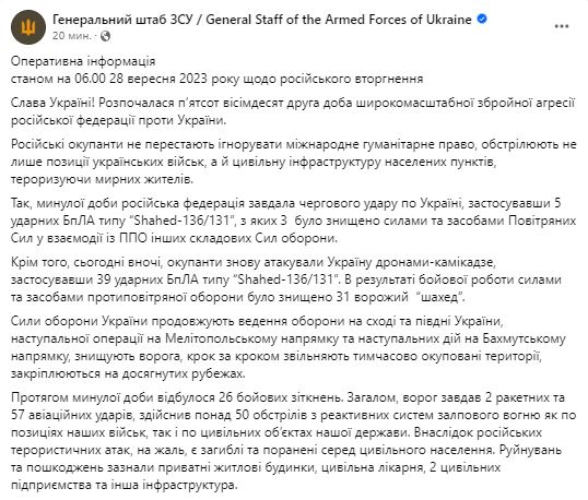 Утром 28 сентября Генштаб ВСУ обнародовал сводку о ситуации на фронте.