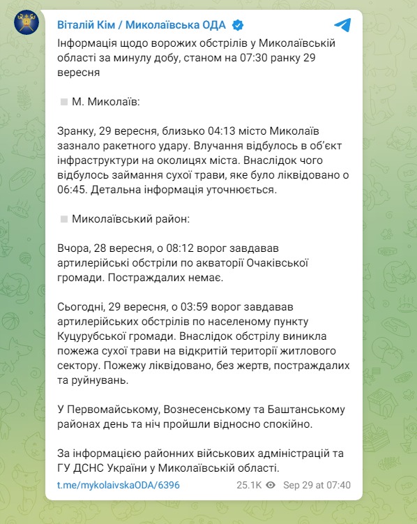Под утро 29 сентября были атакованы россиянами Николаевская и Сумская области.