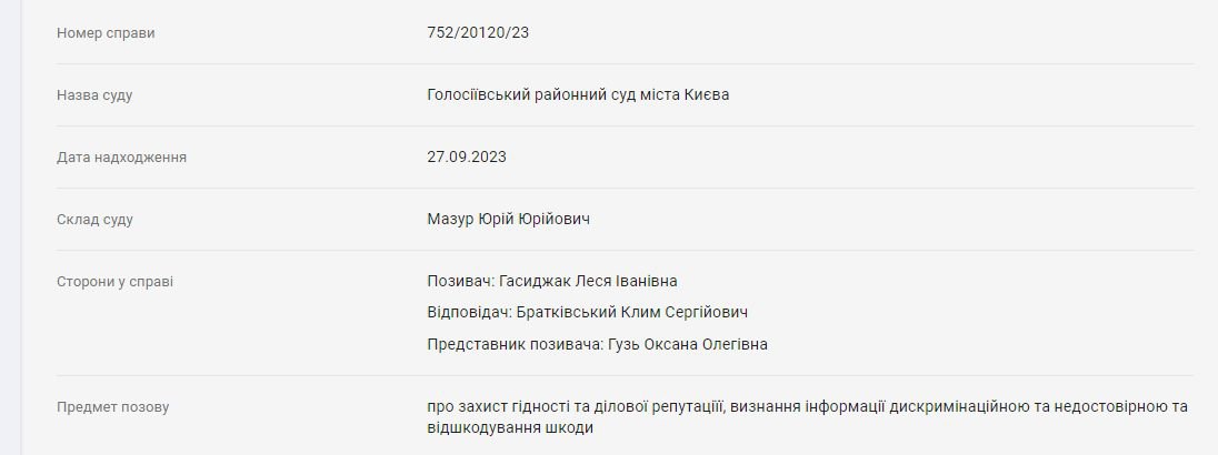 В иске Леси Гасиджак ответчиком указан Клим Братковский. Предмет иска - защита достоинства и деловой репутации, признание информации дискриминационной и недостоверной и возмещение ущерба.