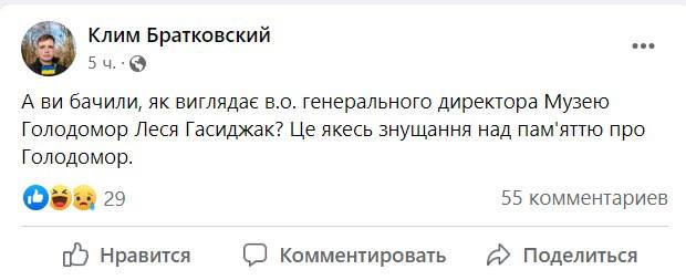 Ранее Клим Братковский раскритиковал внешность Леси Гасиджак и заявил, что человек ее комплекции не может возглавлять организацию, посвященную умершим от голода.