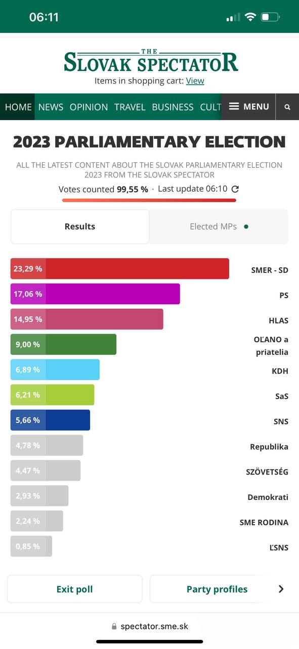 Пророссийская партия экс-премьера Словакии Роберта Фицо, который выступает против поддержки Украины, побеждает на выборах в парламент после подсчета более 99% голосов.
