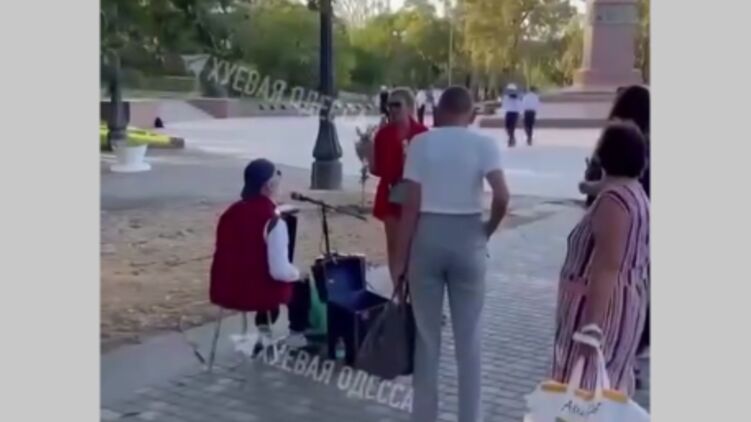 На возмущение женщины исполнением песен на русском, музыкант ответил, что "одесситы всегда говорили на русском языке".