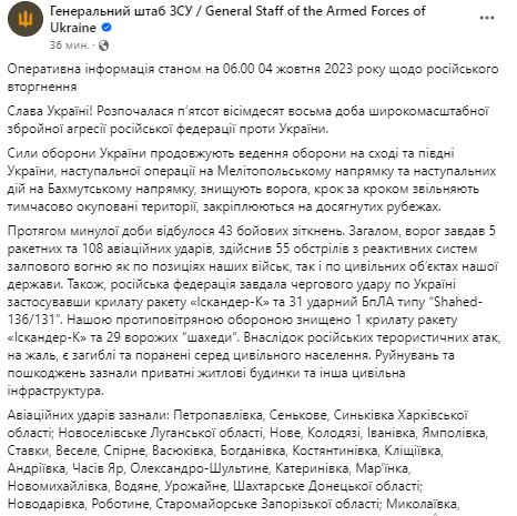 Всего враг нанес 5 ракетных и 108 авиационных ударов, совершил 55 обстрелов из РСЗО. Также, рф нанесла удар, применив крылатую ракету "Искандер-К" и 31 ударный беспилотник. ПВО уничтожила одну крылатую ракету "Искандер-К" и 29 вражеских "шахеда".