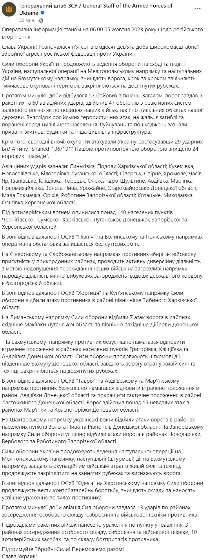 За прошедшие сутки произошло 57 боевых столкновений. Российские войска враг нанесли 5 ракетных и 60 авиационных ударов, совершили 47 обстрелов из реактивных систем залпового огня по позициям наших войск и по гражданским объектам нашего государства.