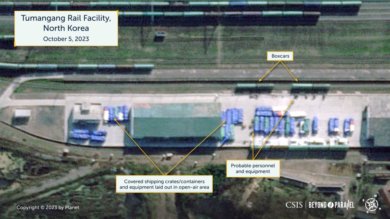 Спутниковые снимки железнодорожного пункта Туманган на границе КНДР с РФ показывают "беспрецедентное количество" грузовых вагонов за 5 октября - около 73 вагонов.