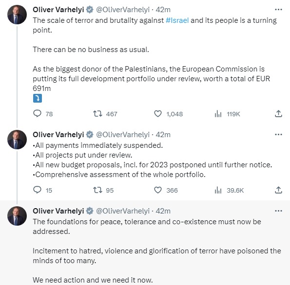 "Масштабы террора и жестокости против Израиля и его народа стали поворотным моментом. Крупнейший донор палестинцев Еврокомиссия начинает пересмотр всего пакета помощи развития в €691 млн. Все платежи будут приостановлены", - гласит пост.