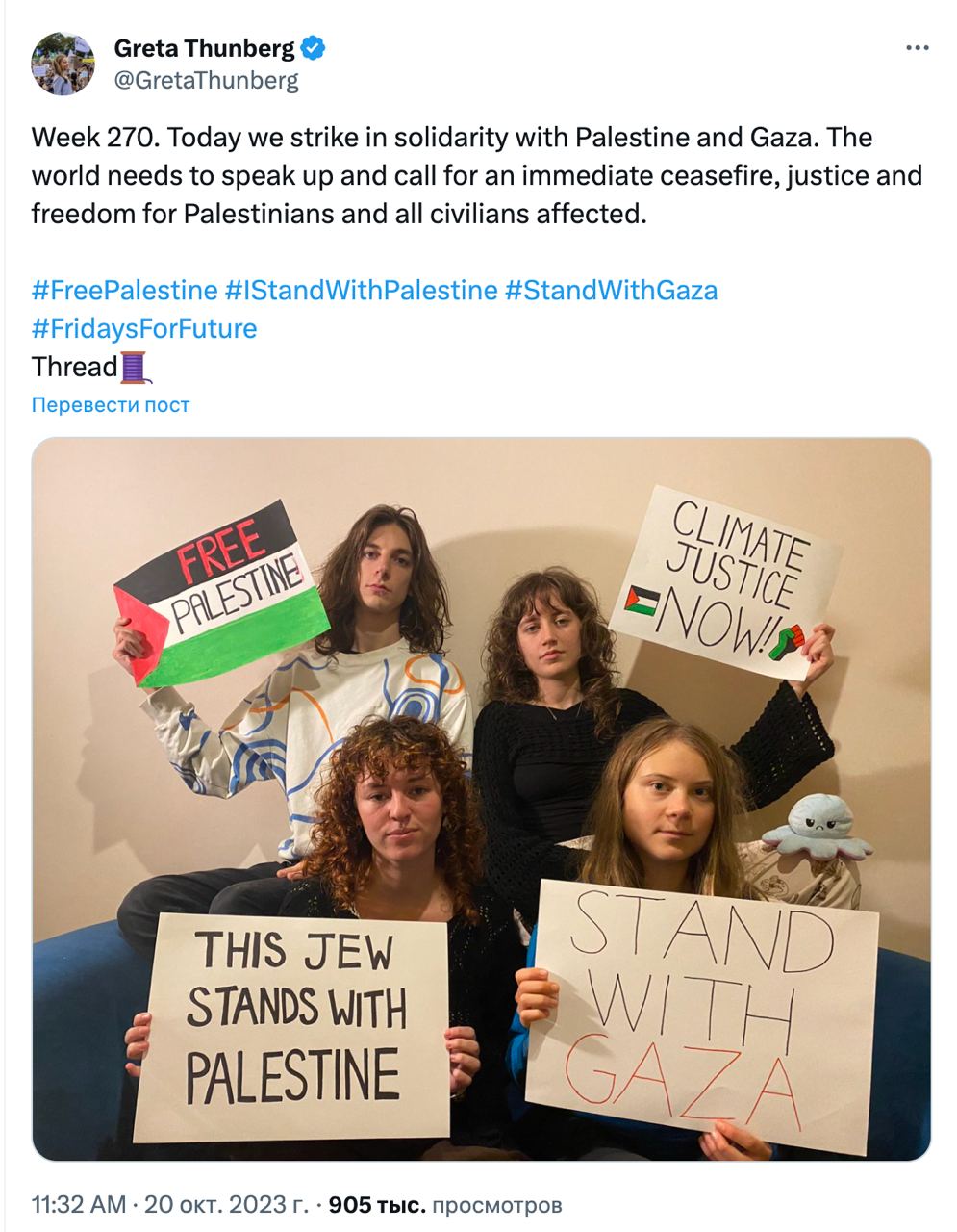 "Сегодня мы бастуем в знак солидарности с Палестиной и сектором Газа. Миру необходимо высказаться и призвать к немедленному прекращению огня, справедливости и свободе для палестинцев и всех пострадавших гражданских лиц", — подписала Тунберг фото, на котором она и группа молодых людей держат плакаты в поддержку Газы.