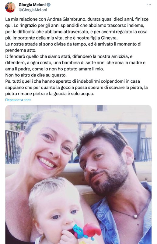 "Мои отношения с Андреа Джамбруно, длившиеся почти десять лет, на этом заканчиваются. Я благодарю его за прекрасные годы и за то, что он подарил мне самое главное в моей жизни – нашу дочь Джиневру. Наши пути давно разошлись, и настало время сделать выводы. Больше мне нечего сказать по этому поводу", — написала Мелони.