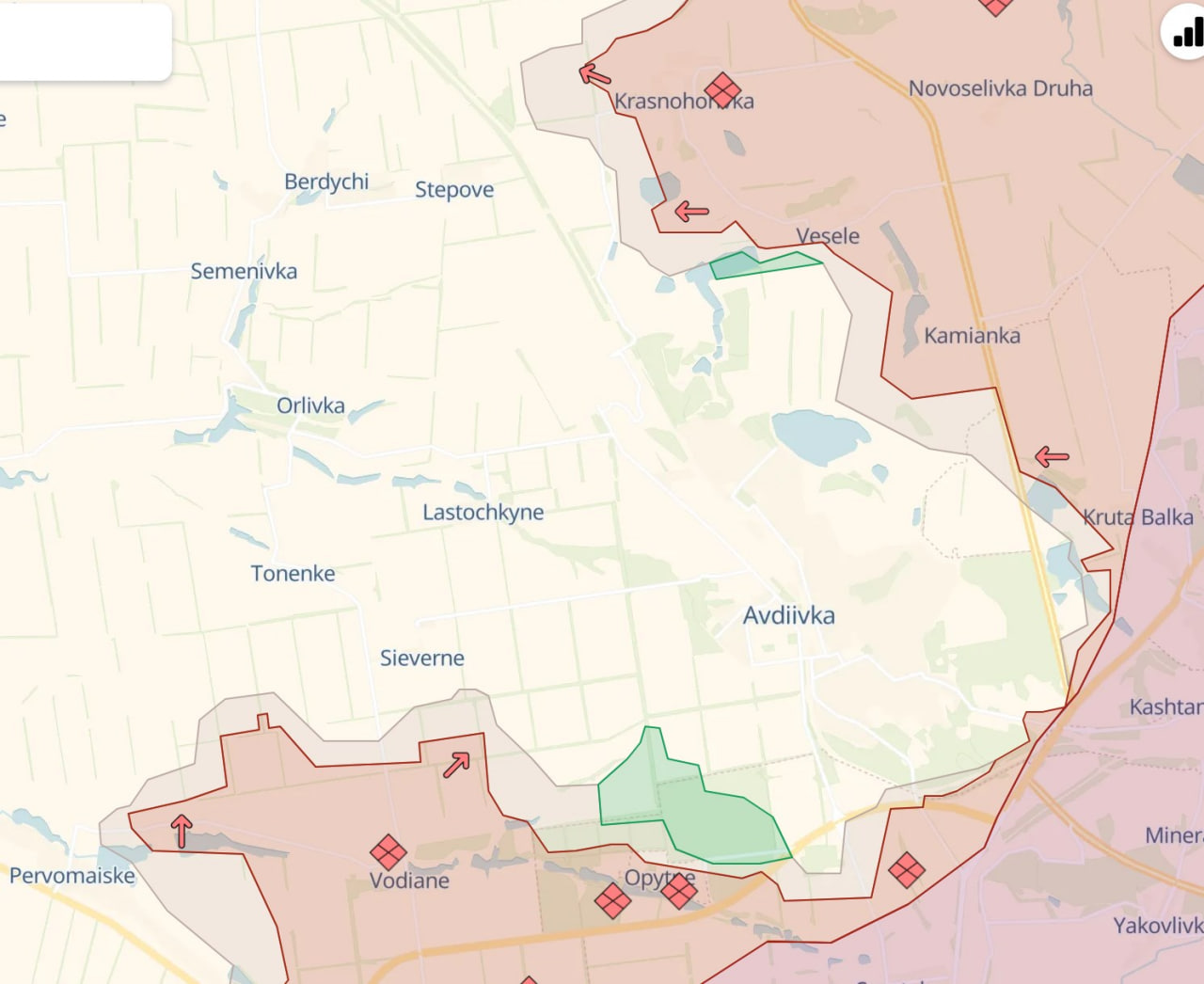 Украинские военные телеграм-каналы уточняют, что российские войска ведут наступление из Красногоровки (то есть с севера). Удар по их колонне нанесли в районе Степного. Также они наступают на авдеевский террикон.