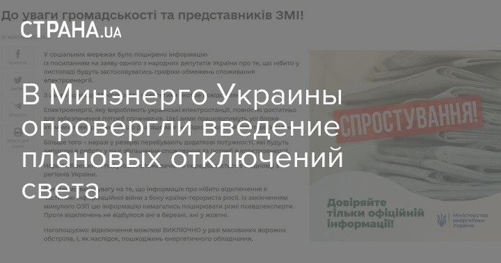 Министерство энергетики Украины опровергло информацию о введении плановых отключений электроэнергии с ноября.