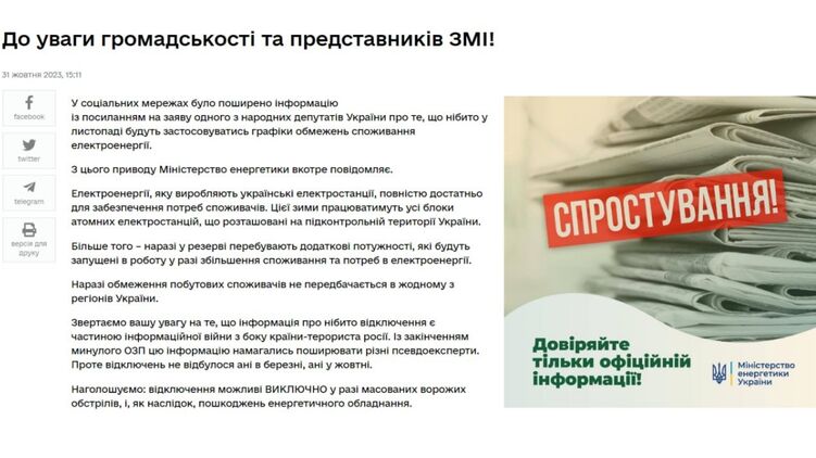 Сообщения об предстоящих плановых отключениях света в Украине министерство назвало частью информационной войны со стороны России.
