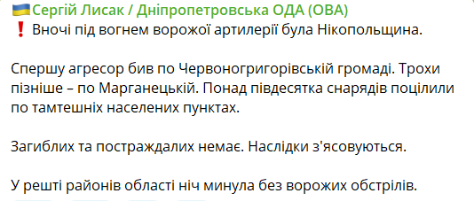 "Сначала агрессор бил по Красногригорьевской громаде. Чуть позже – по Марганецкой. Более полудесятка снарядов попали по тамошним населенным пунктам", - написал он.